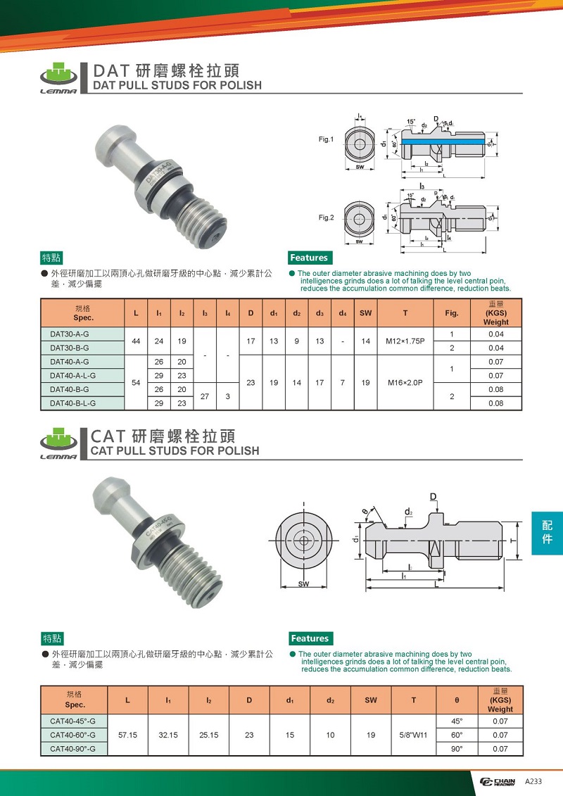 臺灣正河源-Lemma系列 :DAT研磨拉釘,也可以叫SK拉釘-適配標(biāo)準(zhǔn)DIN69871標(biāo)準(zhǔn)的刀柄拉頭;以及CAT主軸接口的拉釘